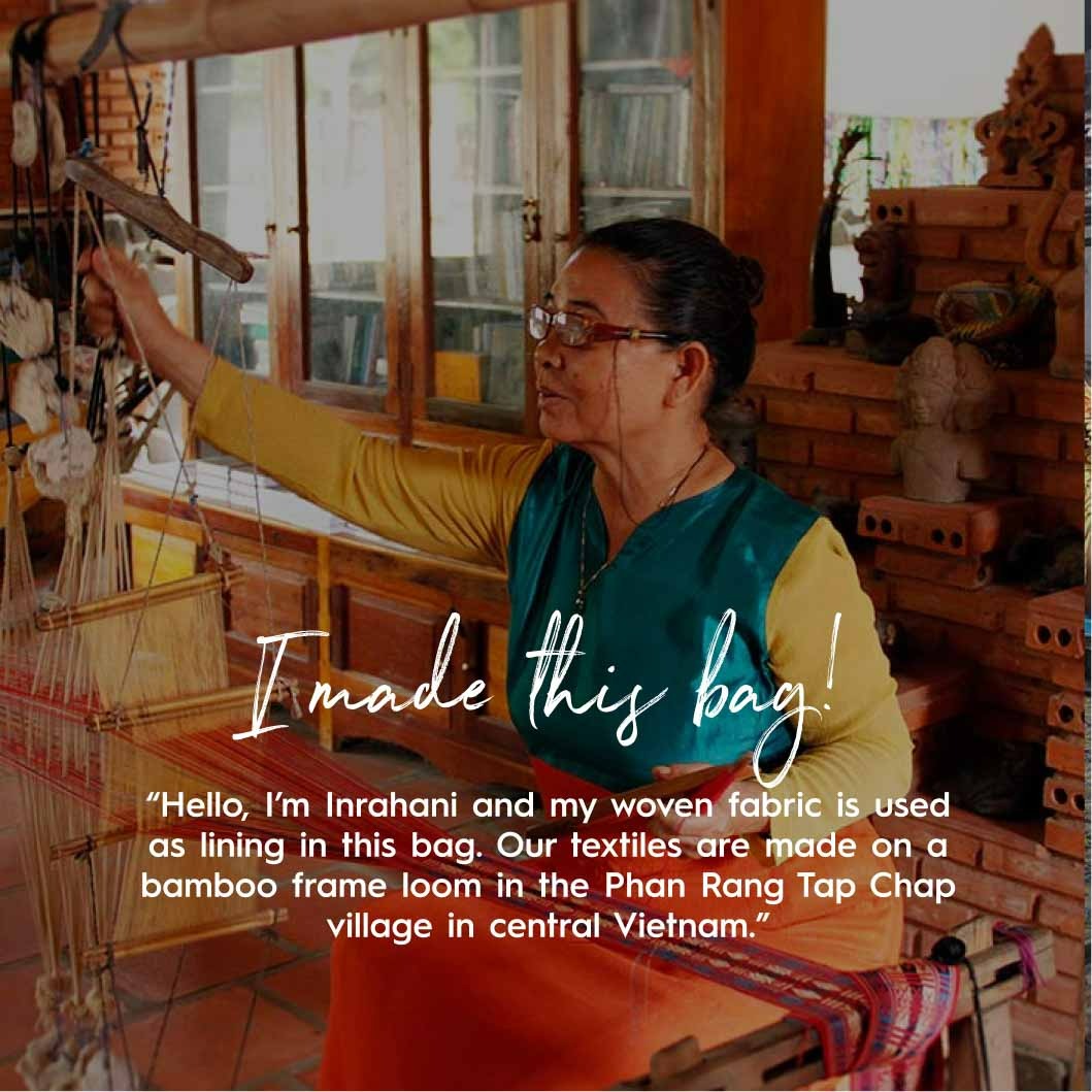 Hallo, ik ben Inrahani en mijn geweven stof wordt gebruikt in veel tassen. Onze textielproducten worden gemaakt op een bamboe weefgetouw in het dorp Phan Rang Tap Chap in Centraal-Vietnam. We zijn trotse afstammelingen van het koninkrijk Champa en danken u voor uw steun.