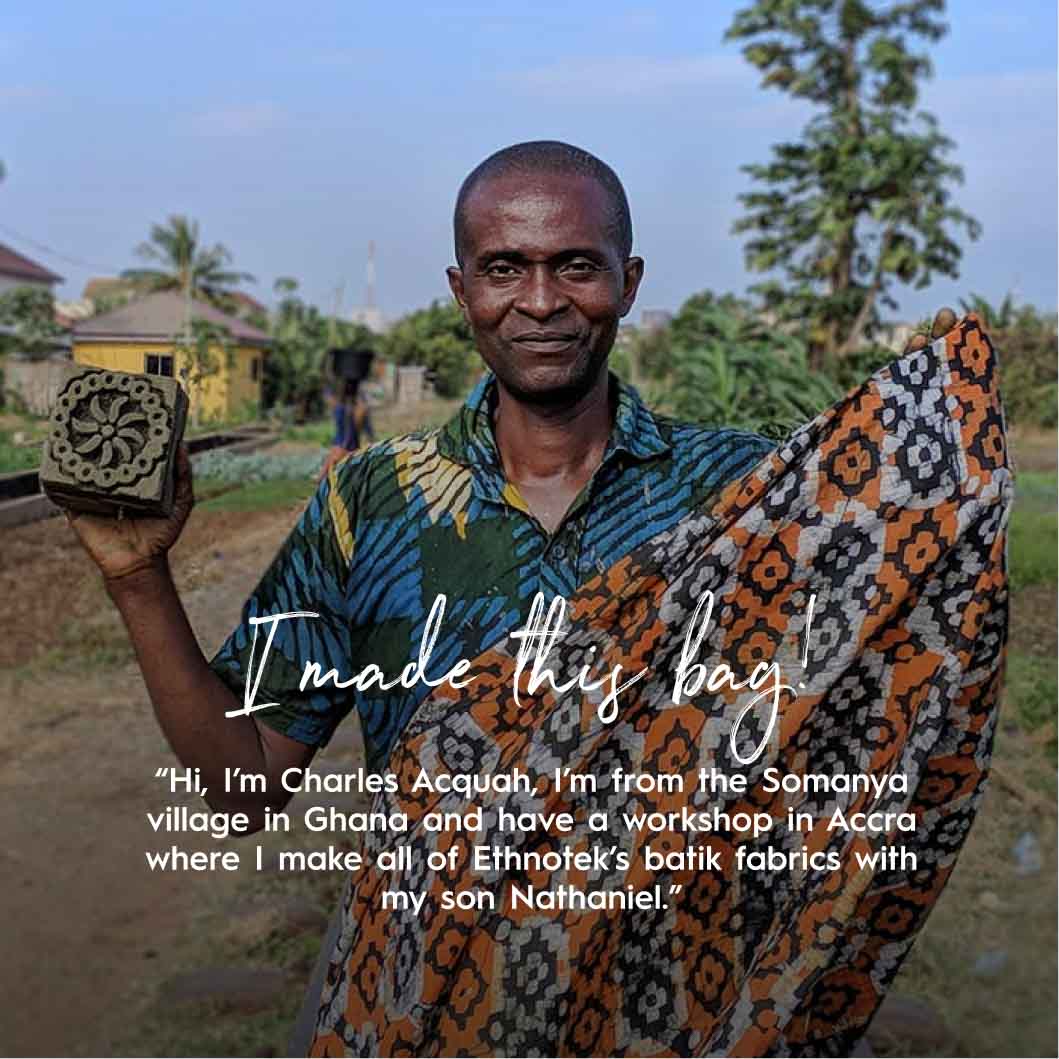 Hallo, ik ben Charles Acquah. Ik kom uit het dorp Somanya en heb een atelier in Accra waar mijn zoon Nathaniel en ik batikstoffen uit Ghana produceren voor Ethnotek. Onze ontwerpen zijn geïnspireerd op traditionele Adinkra-symbolen.