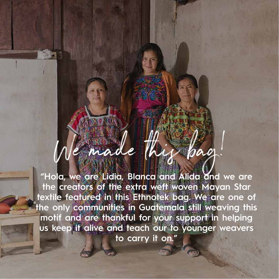Hallo, wij zijn Lidia, Blanca en Alida, de makers van de unieke Maya-ster. Ons weefatelier bevindt zich in Comalapa, Guatemala. We produceren maximaal 20 meter stof per maand, omdat dit veelkleurige ontwerp zo ingewikkeld en tijdrovend is. We zijn erg blij met de grote populariteit van de Maya-ster! De vraag vanuit Ethnotek stelt ons in staat om door te gaan met het weven van dit ontwerp en om onze jongere wevers op te leiden.