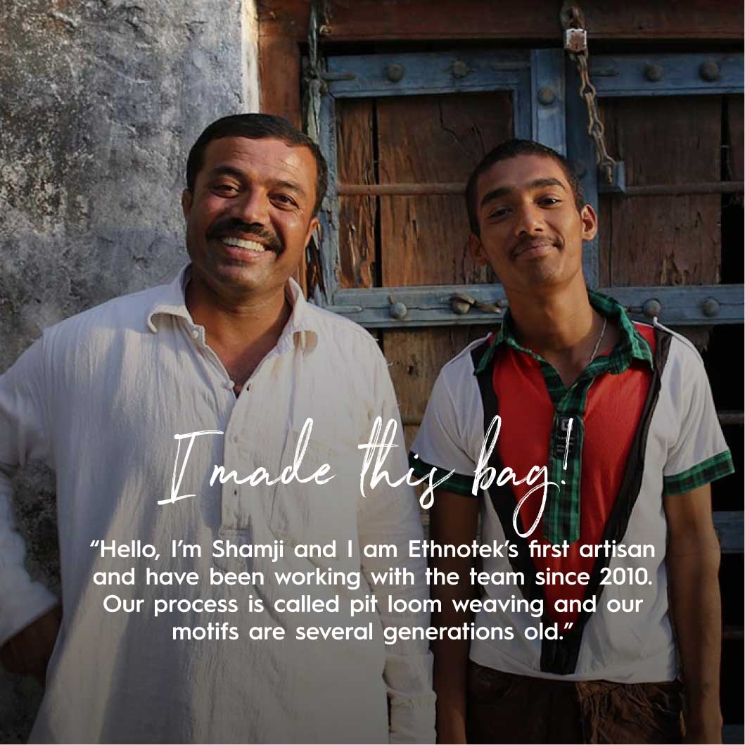 Hallo, ik ben Shamji en ik ben de eerste ambachtsman waarmee Ethnotek sinds 2010 samenwerkt. We weven als gemeenschap met behulp van een handgemaakt weefgetouw. De ontwerpen zijn al generaties oud. Mijn familie en ik zijn gemeenschapsleiders van het Vankar-volk. Textielweven is een essentieel onderdeel van onze identiteit en mijn rol is om de volgende generatie ambachtslieden op te leiden, zodat we onze tradities via hen kunnen behouden. Kom gerust eens langs in Bhujodi, India; we kijken ernaar uit u te ontmoeten!