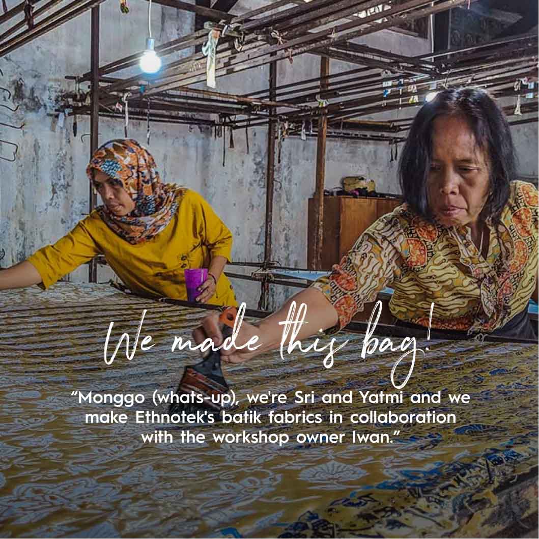 Monggo (Hallo!), wij zijn Sri en Yatmi, en samen met Iwan produceren we batikstoffen uit Indonesië. Iwan is een batikmeester van de vijfde generatie en zet de familietraditie voort. We hebben een speciaal proces met een laag waterverbruik, waarbij de verf met de hand op de stoffen wordt aangebracht nadat onze vriend Harjono ze met was heeft gestempeld.