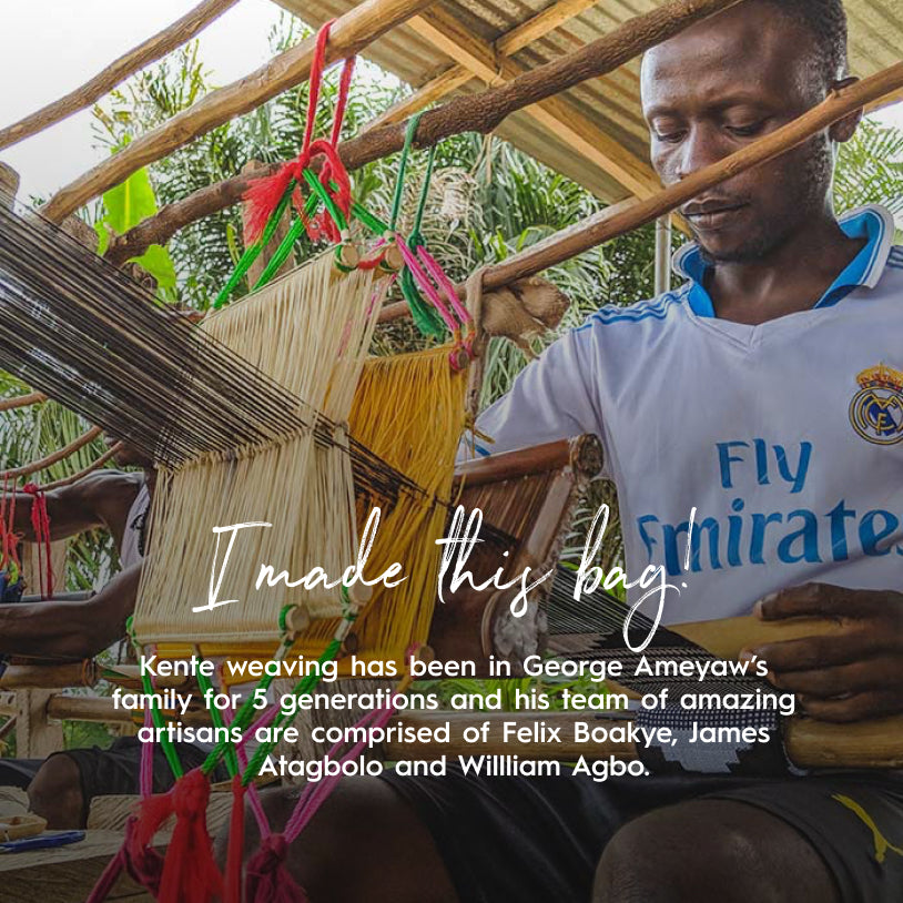 Kente-weven zit al vijf generaties lang in de familie van George Ameyaw en zijn team. Georges getalenteerde meesterwevers zijn Felix Boakye, James Atagbolo en William Agbo. Hun atelier bevindt zich in Accra, Ghana, en hun techniek heeft traditionele wortels die teruggaan tot de 17e eeuw en vindt zijn oorsprong bij de Ashanti-, Akan- en Ewe-stammen.