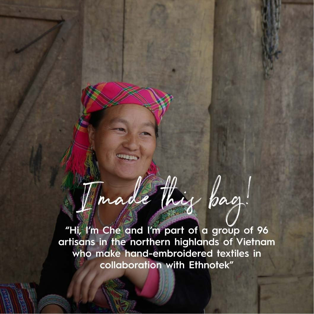 Hallo, ik ben Che en ik behoor tot een groep van 96 ambachtslieden in de noordelijke hooglanden van Vietnam die in samenwerking met Ethnotek handgeborduurde textielproducten maken. Wij Hmong-vrouwen maken slechts twee traditionele rokken per jaar. Het ingewikkelde borduurwerk is onze favoriete hobby, die we beoefenen tijdens onze pauzes op het land. Dit ambacht is ons erfgoed, dat we met trots in stand houden, en we genieten ervan omdat het ons vaak samenbrengt om te lachen en grappen te maken.