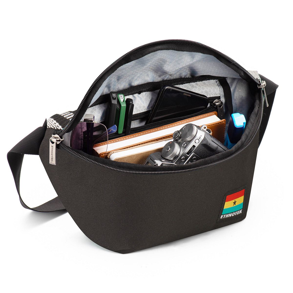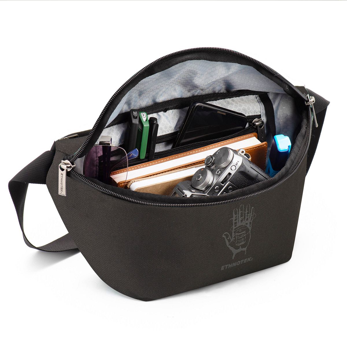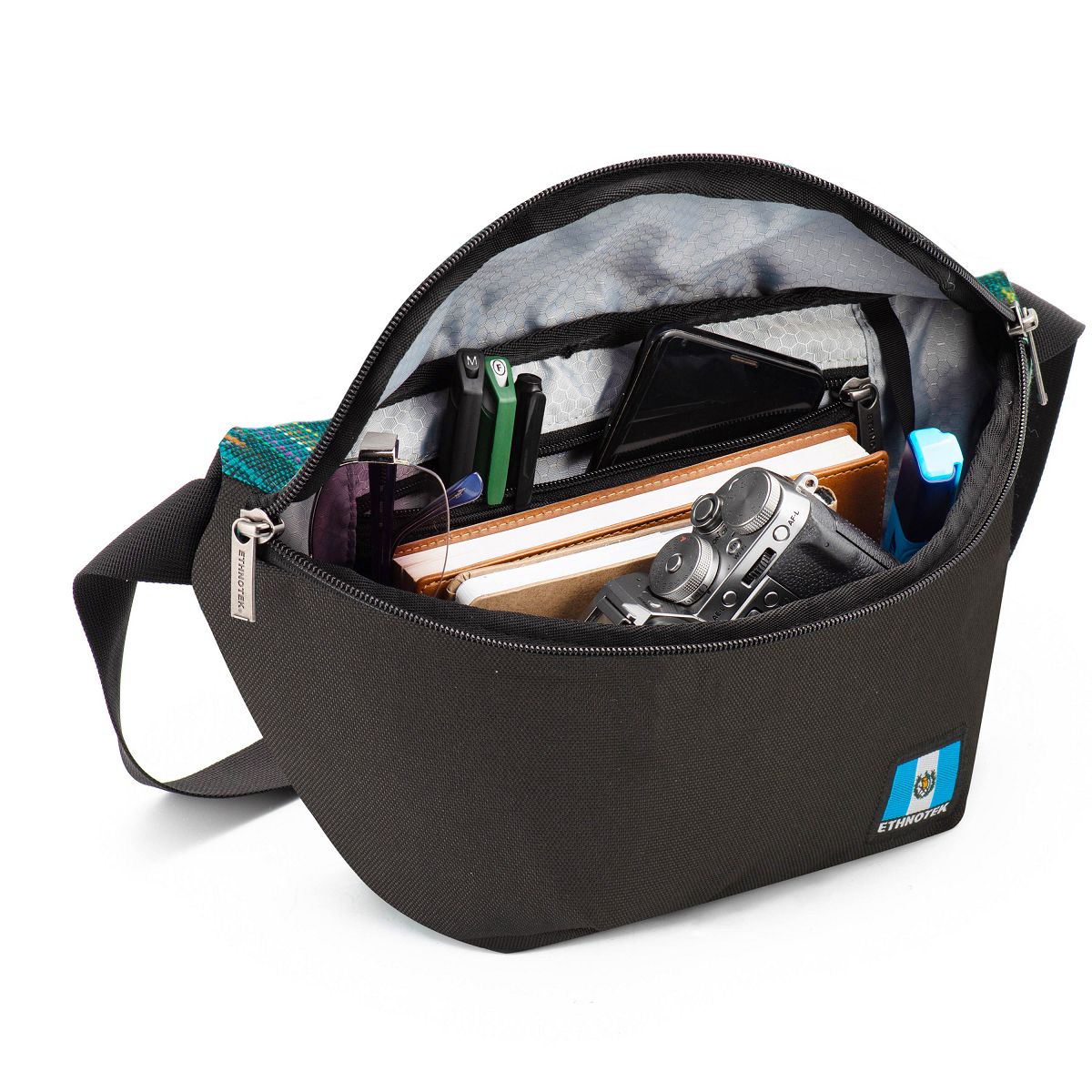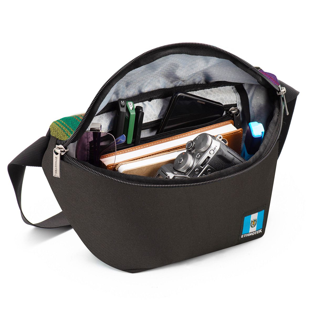 Het grootste deel van de tas is gemaakt van waterafstotend PET Recycled Tech-materiaal, vervaardigd uit 100% gerecyclede plastic flessen. Een discreet, nauwsluitend vak met ritssluiting aan de achterkant biedt veilige opbergruimte voor een paspoort, contant geld of reisdocumenten. Het hoofdcompartiment is gevoerd met waterafstotend ripstop-materiaal en heeft een geïntegreerd gaasvak met ritssluiting en een sleutelclip.