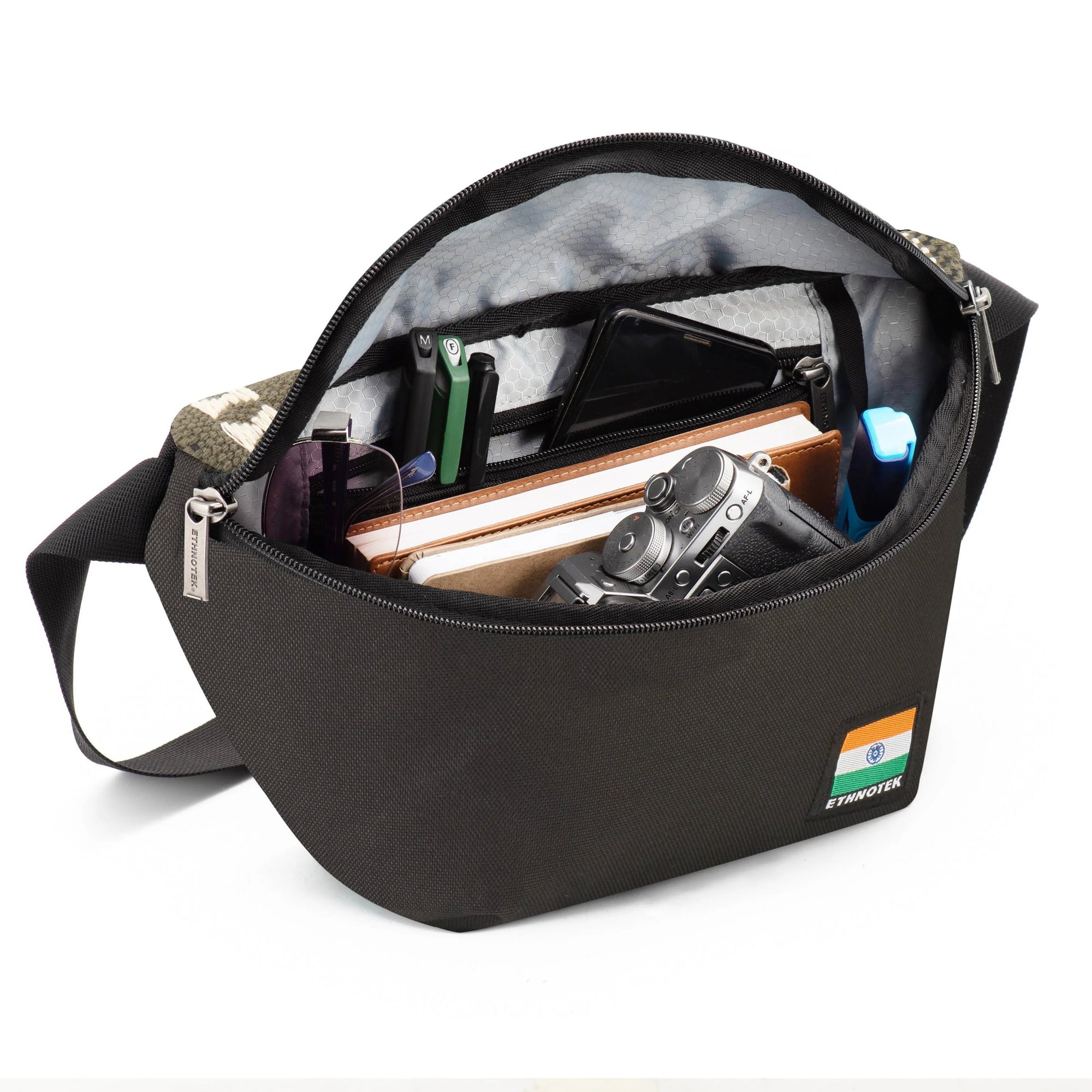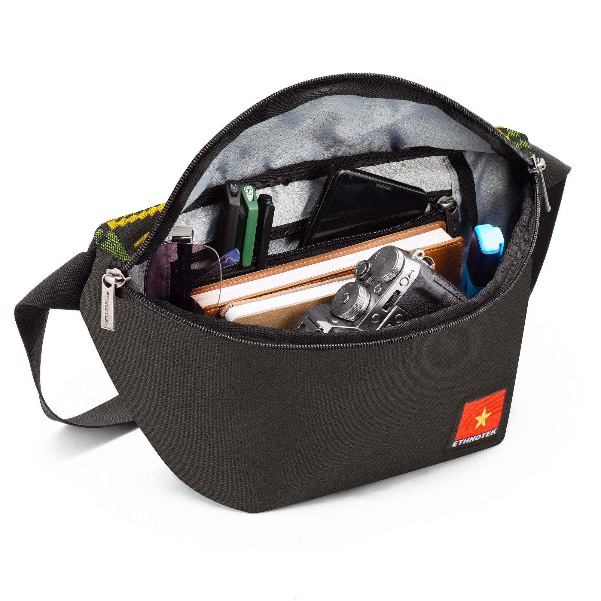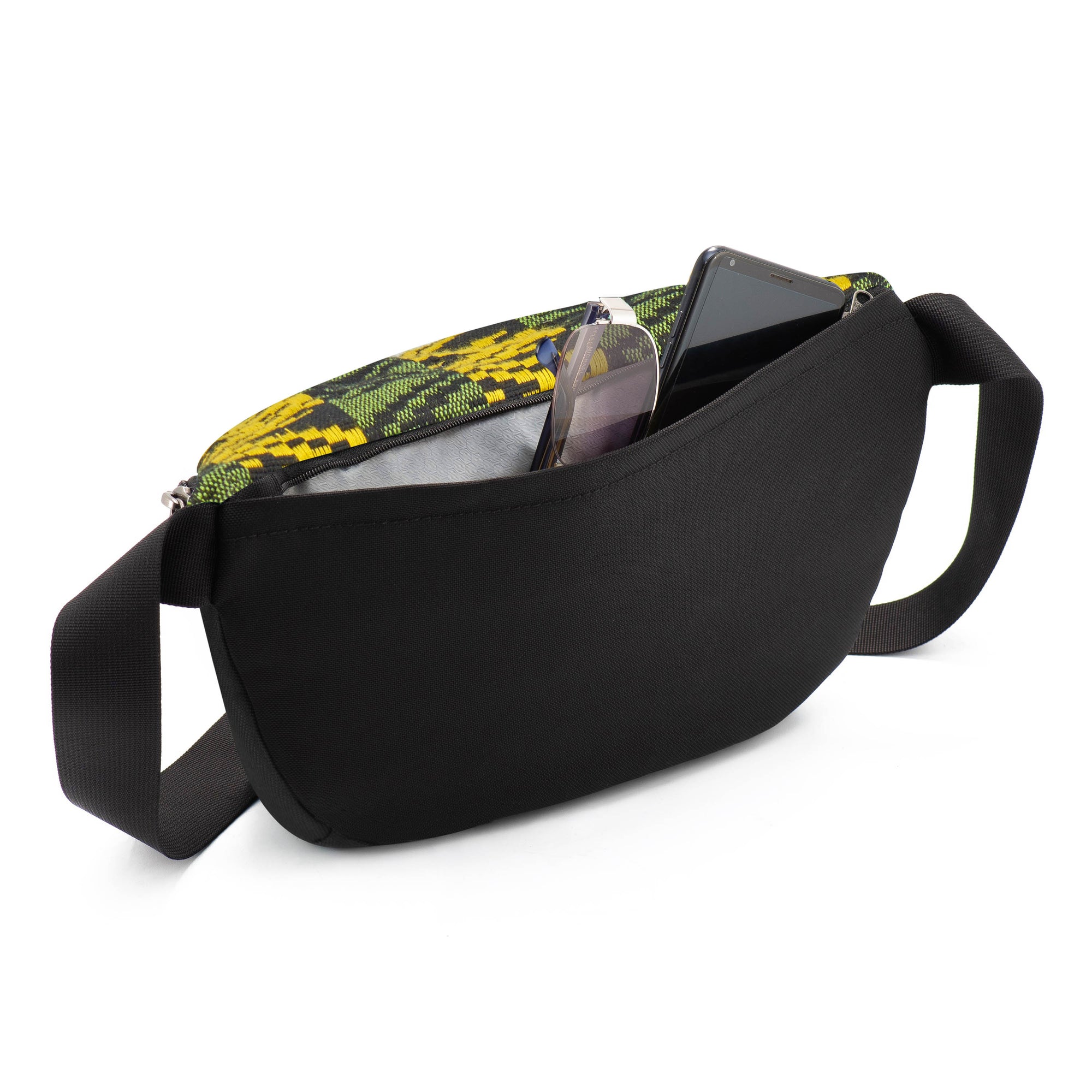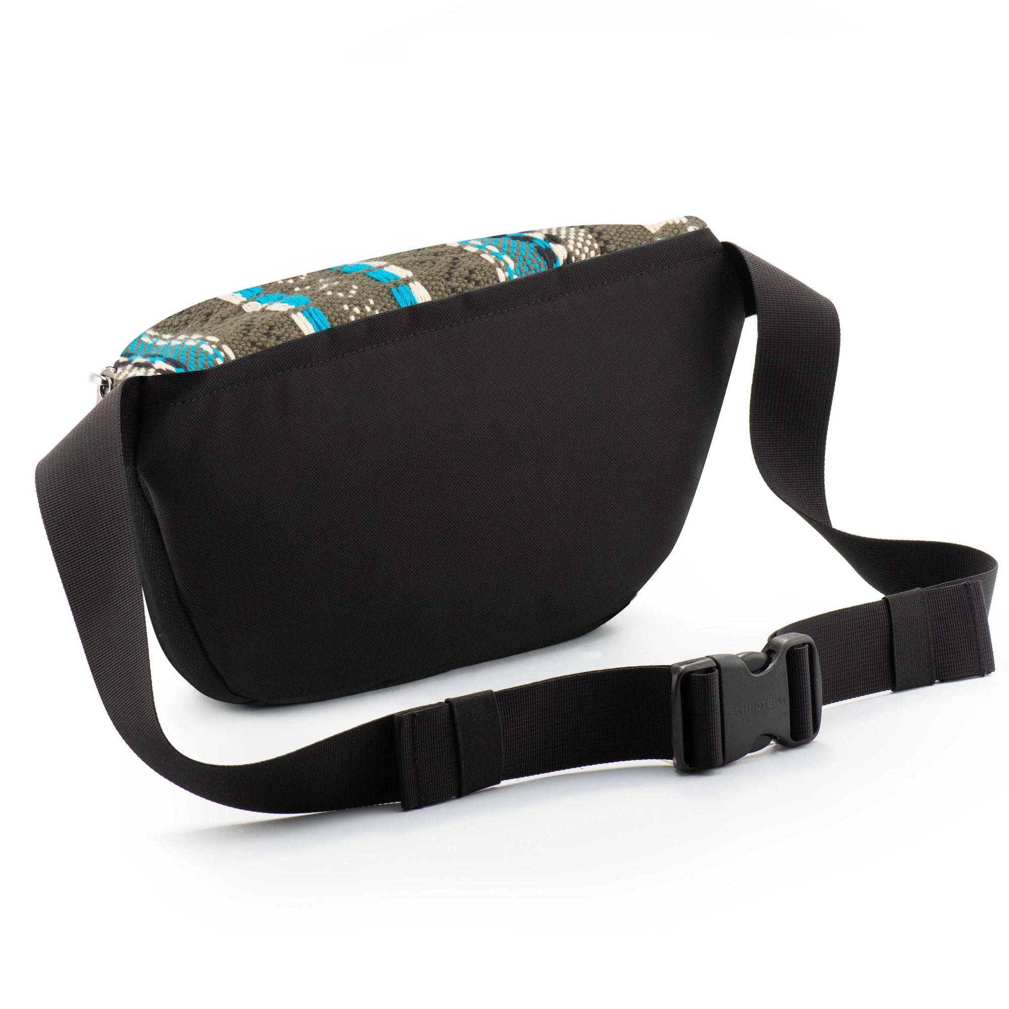 Het grootste deel van de tas is gemaakt van waterafstotend PET Recycled Tech-materiaal, vervaardigd uit 100% gerecyclede plastic flessen. Een discreet, nauwsluitend vak met ritssluiting aan de achterkant biedt veilige opbergruimte voor een paspoort, contant geld of reisdocumenten. Het hoofdcompartiment is gevoerd met waterafstotend ripstop-materiaal en heeft een geïntegreerd gaasvak met ritssluiting en een sleutelclip.