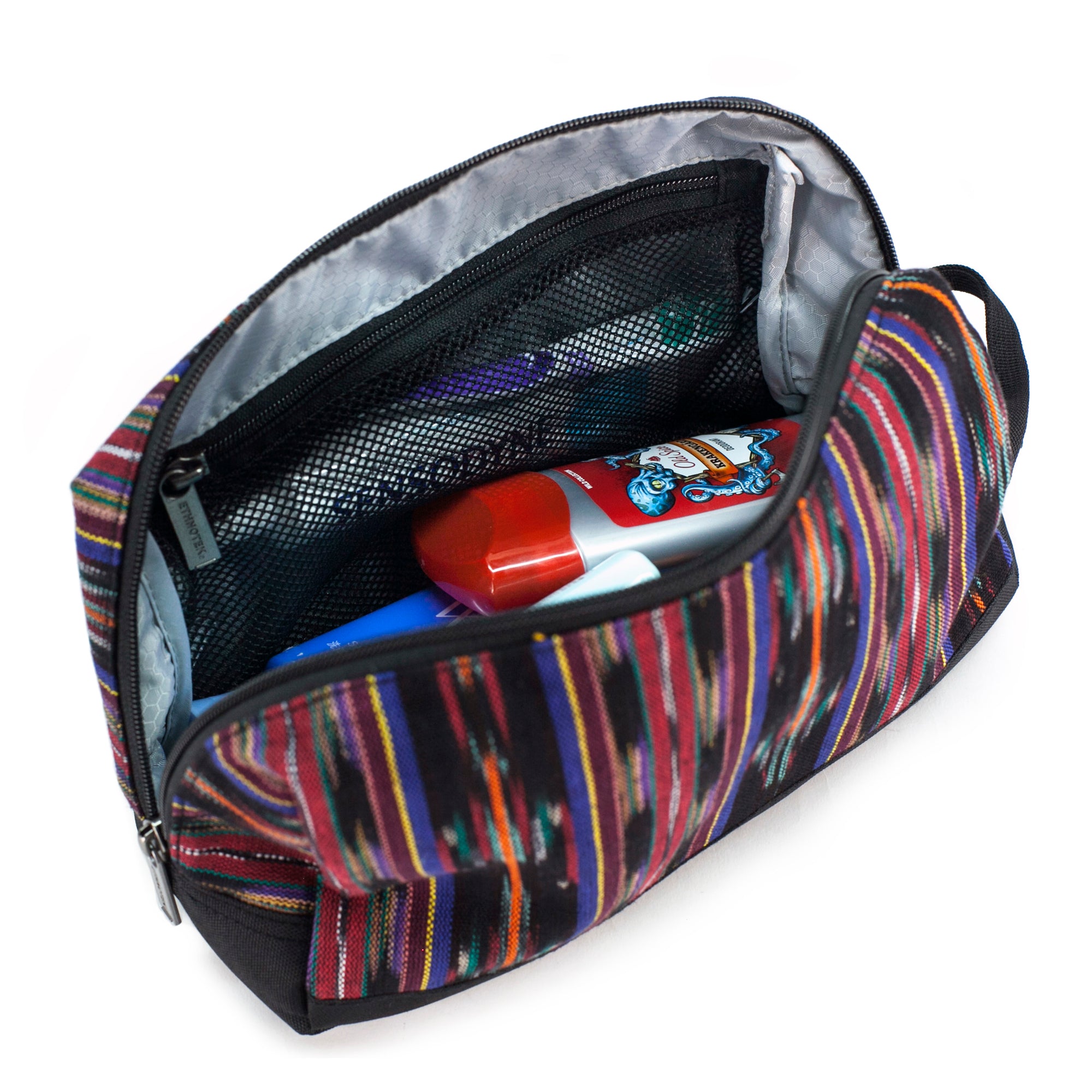 De voering is gemaakt van duurzaam ripstop nylon met een honingraatstructuur. Binnenin bevinden zich twee vakken met ritssluiting – een van gaas zodat de inhoud zichtbaar blijft, en een van geseald nylon om tandenborstels droog en hygiënisch gescheiden van de rest te bewaren.