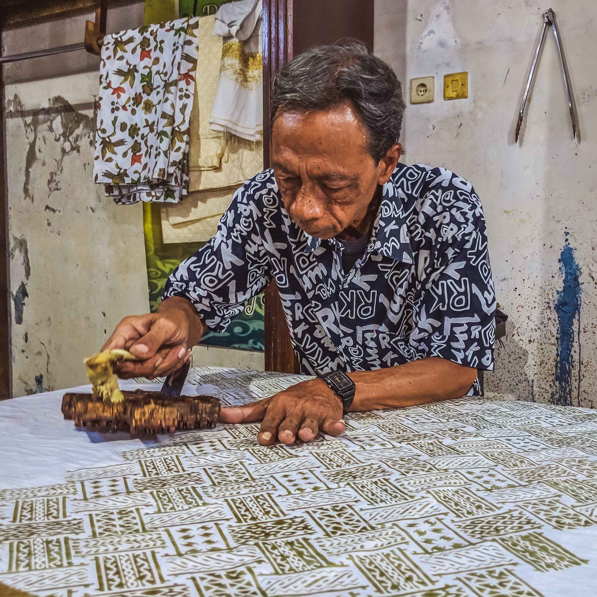 Monggo (Was geht!), wir sind Sri und Yatmi und wir stellen gemeinsam mit Iwan die Batikstoffe aus Indonesien her. Iwan ist Batikmeister in der fünften Generation und setzt die Tradition seiner Familie fort. Wir haben ein spezielles Verfahren mit geringem Wasserverbrauch, bei dem die Farbe von Hand auf die Stoffe gemalt wird, nachdem unser Freund Harjono sie mit Wachs gestempelt hat.